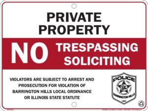 Village ordinances on solicitation and trespass to land require clear notice from the property owner or occupant to prohibit such activity. The Barrington Hills Police Department strongly encourages all residents to post a visible sign at the main entrance to their property—such as on a mailbox post or fire grid address sign—indicating that solicitation and trespassing are not permitted.